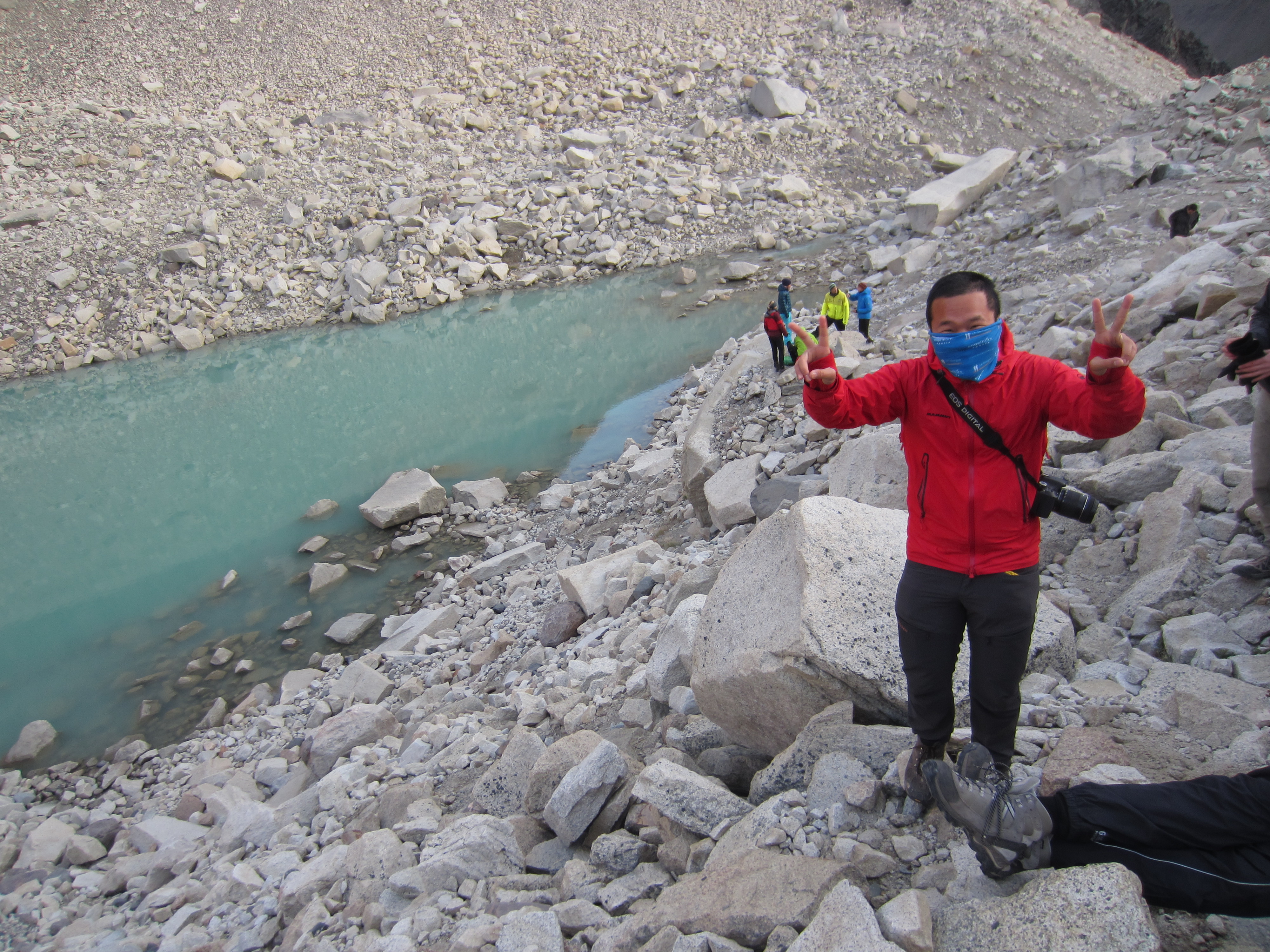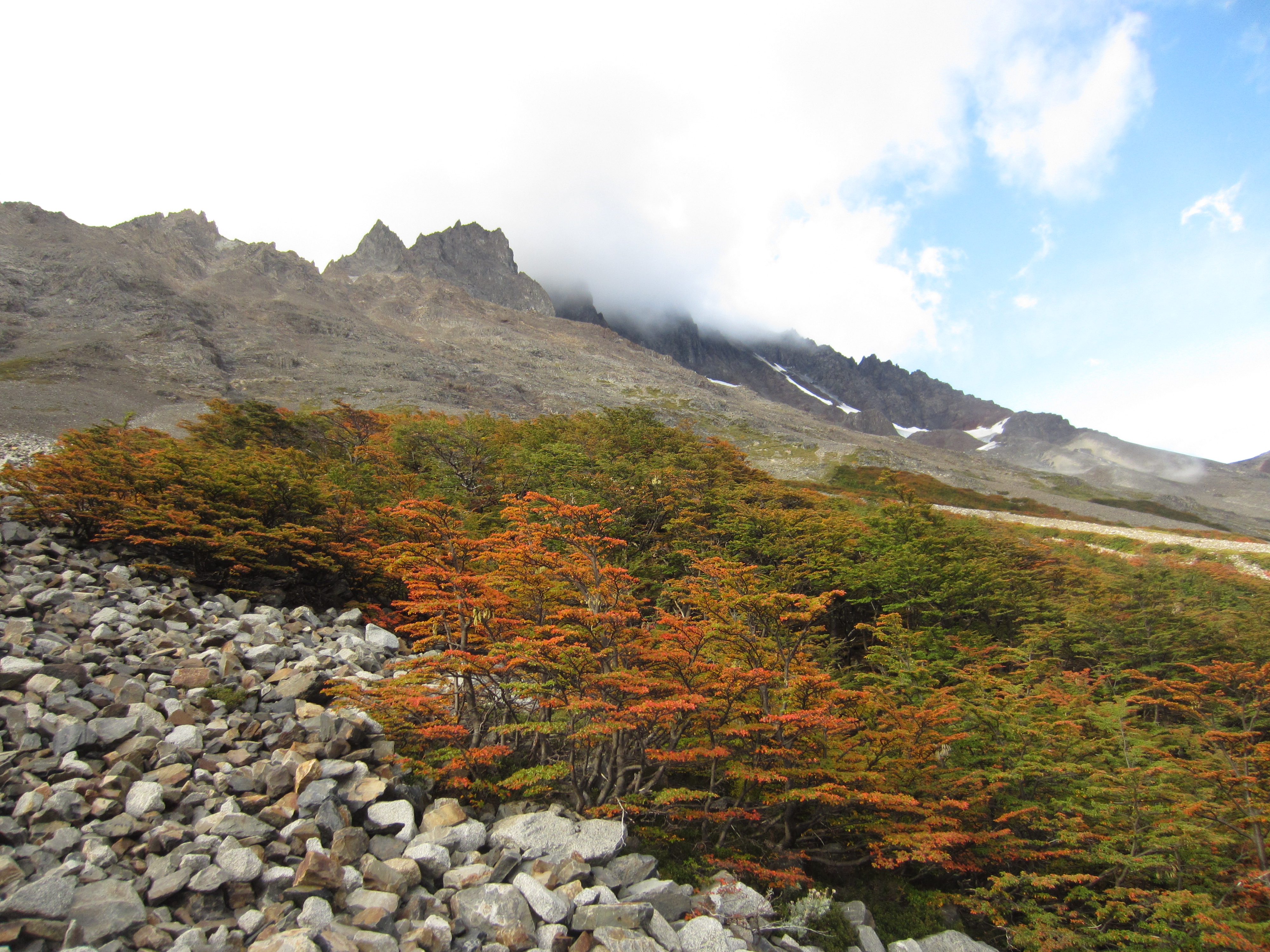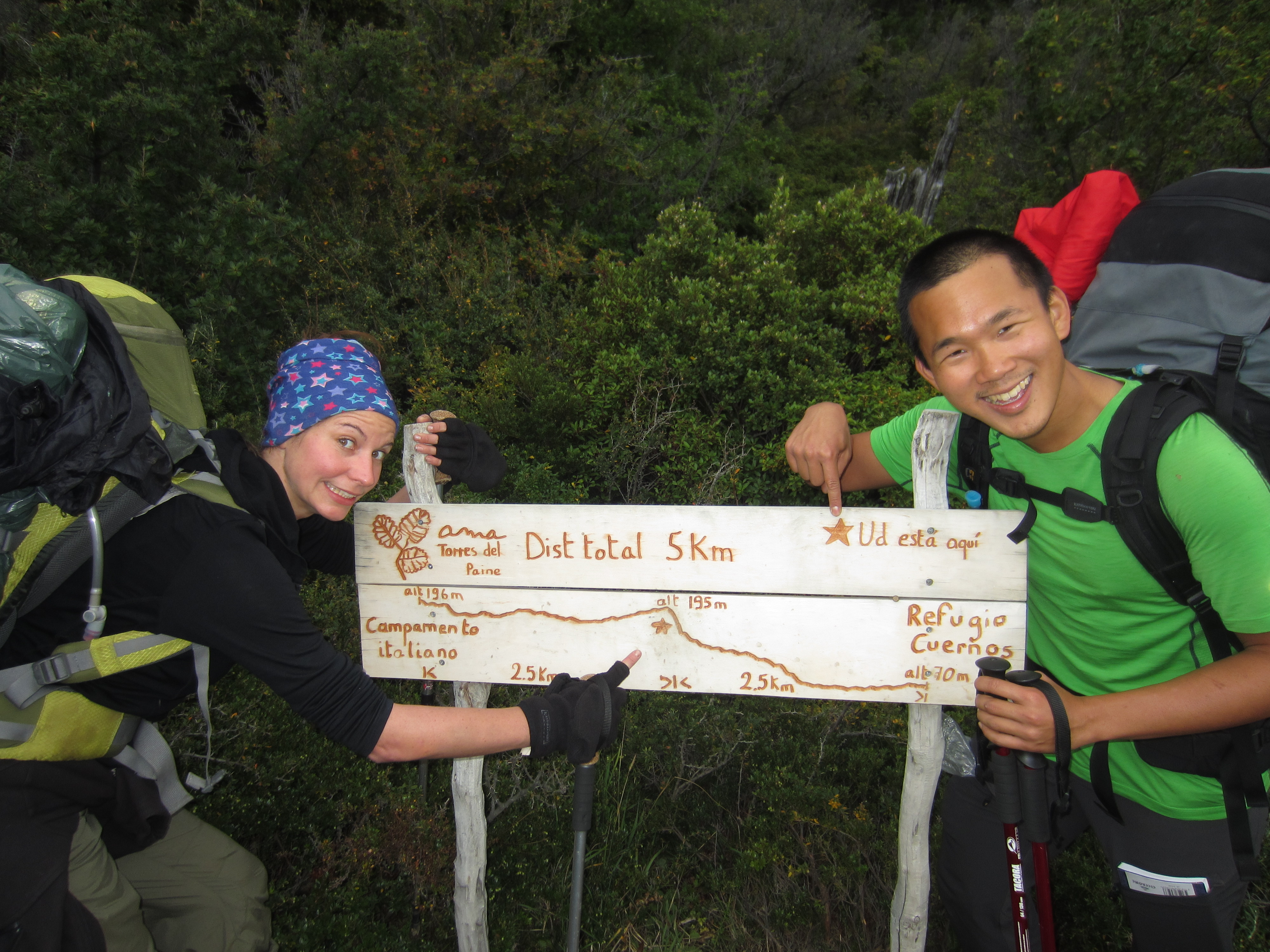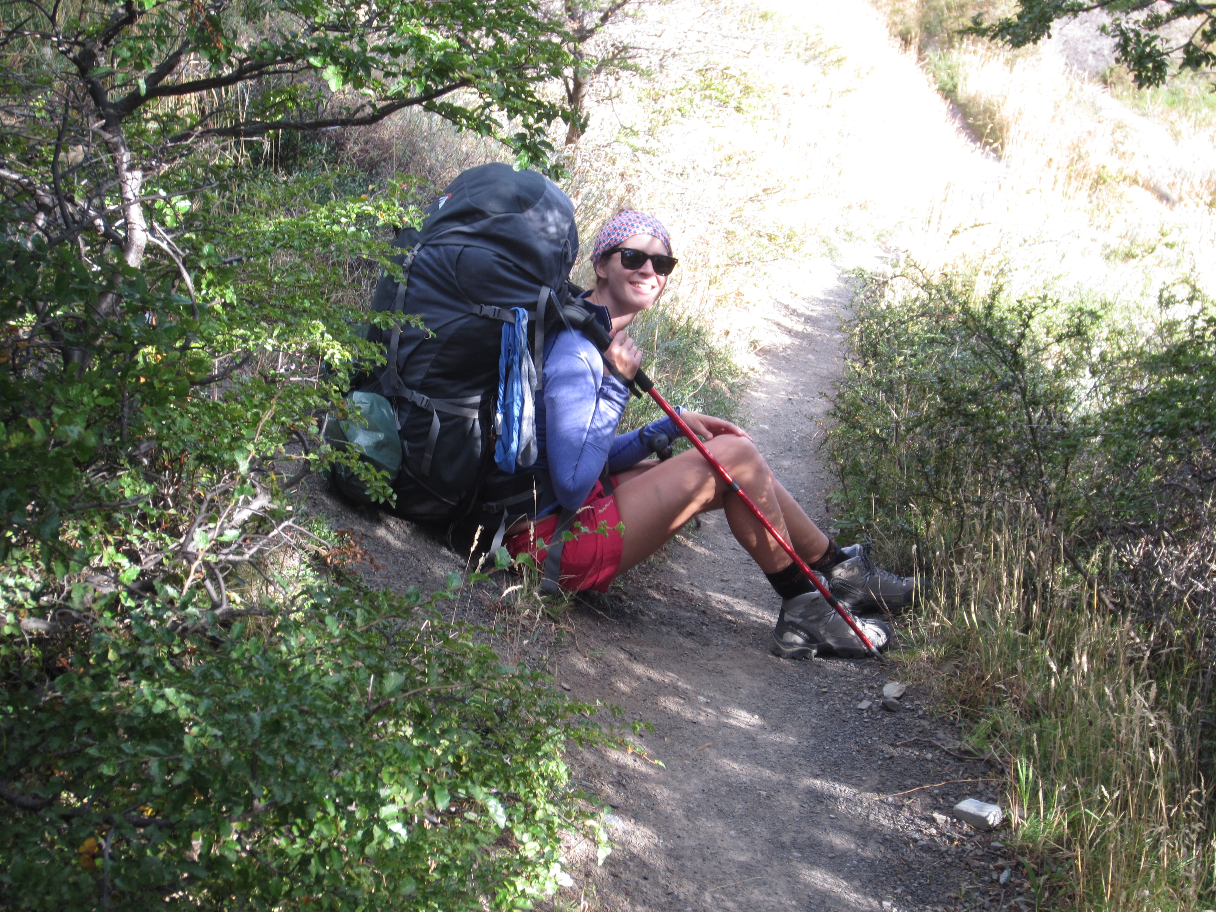 The girl (whose name is escaping me right now), who we’d seen practically blossom on a daily basis, having come away with zero trekking experience and be thrown by her boyfriend Dan into one of the most famed hikes in Patagonia, whenever we had a bit of a tough time, we kept saying we wondered how she was coping, and making jokes about how many make-up points she’d accumulated since heading off. “That’s one bigass piece of jewellery he owes her now…” etc) shouted back to us: “We have a big problem..”