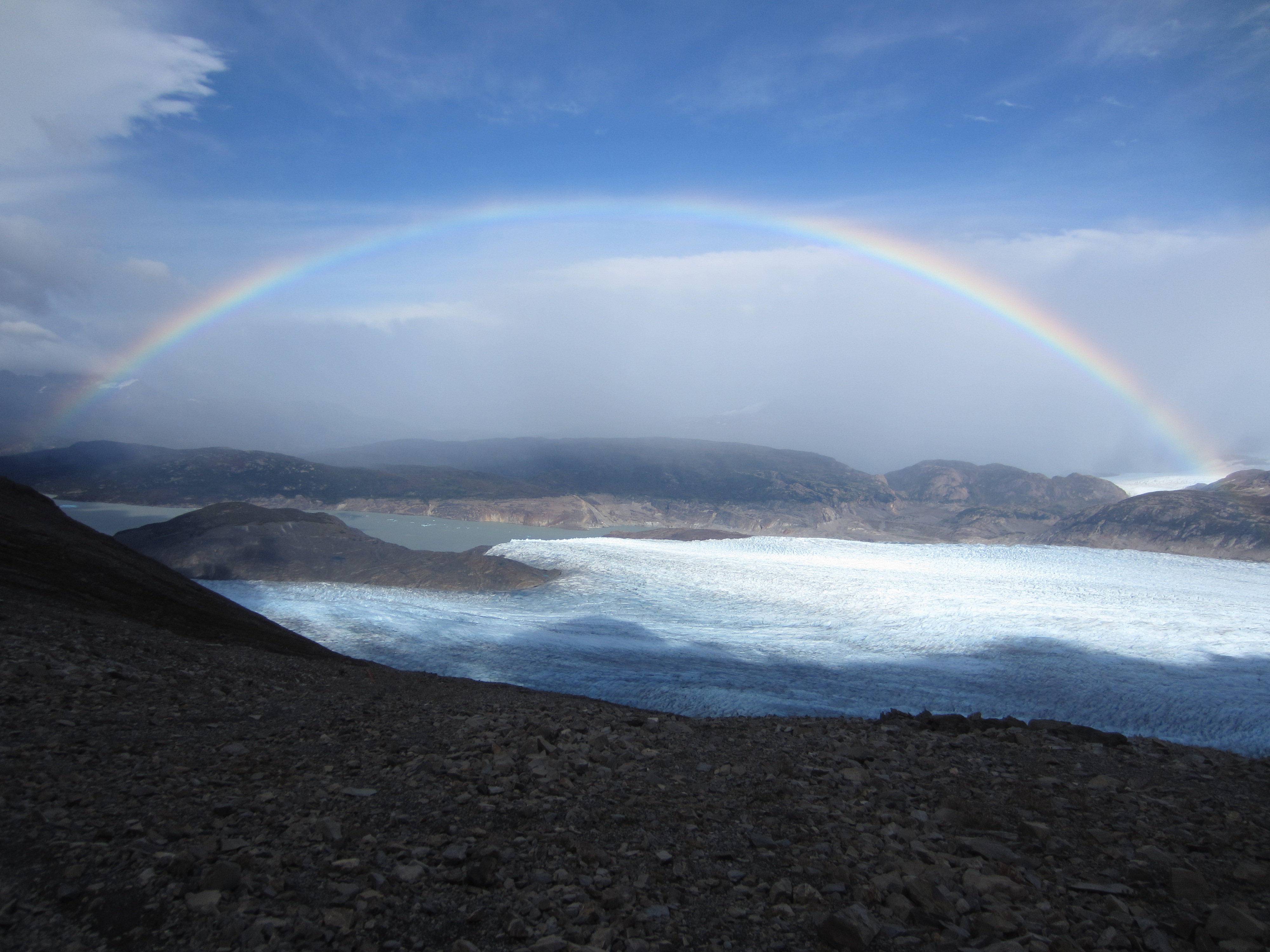 Pippa was equally fed up. We talked about it, and Dan, the voice of reason, was showing us both sides of pros and cons (we’ve come all this way, do we want to rush through and only get to the nicest campsite in the dark when you can’t enjoy it, and have to trek all that way again on our sore, tired feet, etc). Chris wanted to power on, while Bryan was pretty clear he wanted to camp and enjoy the final day on a decent night’s sleep. It was opened to debate, but one look at Pippa’s feet made our decision for us. The poor girl had just hiked about 8km, up and down hills, with a full pack on, and her 6’1″ beautiful frame had been carrying all that on feet covered in about 30 blisters. There were blisters upon blisters. It made me want to cry just looking at them, and I still to this day have no idea how she managed it. Heroine. And I know she was gutted as in her heart, mind and the rest of her body she was keen to crack on, but her sorry feet held her back. So, we decided to call it a day and stop at the campsite which overlooked the glacier (amazing), with a full, clear, end to end rainbow in the backdrop (couldn’t have made it up), and our own private stream.