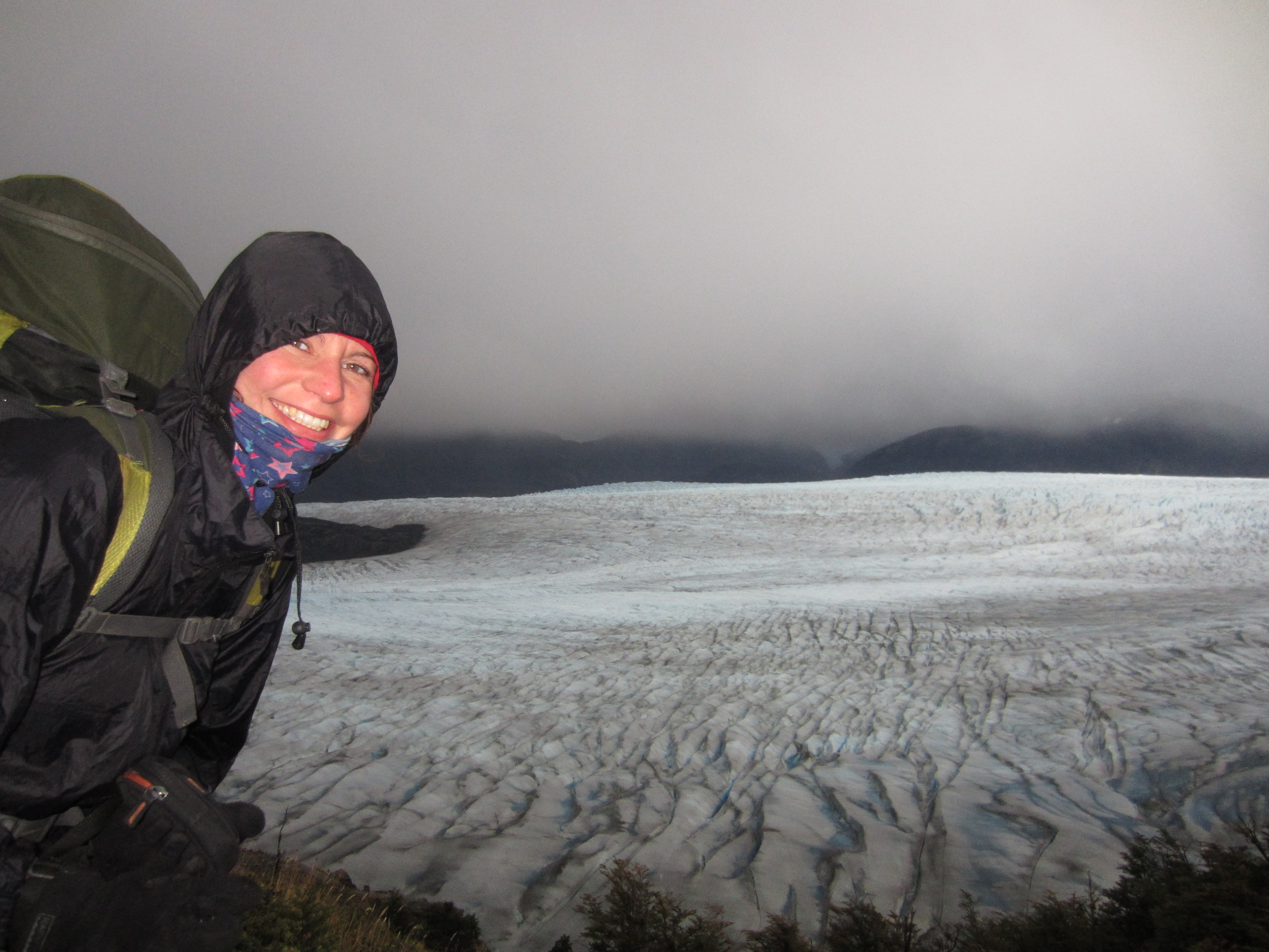 This was the hardest morning, for me anyway. It simply wasn’t fun anymore, and I just wanted it over with. Don’t get me wrong, it was still beautiful, very eerie actually, with the glacier in first light, the lake taking on a grey hue with only the odd very turquoise iceberg to see, and the forest bathed in grey as well. But my fingers were frozen to the point of pain in their wet-through gloves, my shoulders were starting to ache like hell, I was sick of carrying my backpack, and sick of not sleeping. The torrential rain didn’t help, especially as, following Rusty’s advice of not wearing waterproofs during the day, I’d worn my jacket but didn’t bother with the trousers, so my legs were soaked and freezing. I was losing my sense of humour, and was beyond taking pictures as my camera would have just got wet anyway. Luckily, I have realised that I have an immense capacity for holding back energy for when it is really required, and my spare tank was full. As pacemaker (and I apologise to Dan, Pippa and Bryan once again for my lack of conversation and nutty speed going down, but I still think it was the better option!) I pretty much steamed back to camp as quickly as possible, and once I also needed the loo, the stops became pretty non-existent (too wet and cold to enjoy the views) and it was a race to get back as soon as possible.