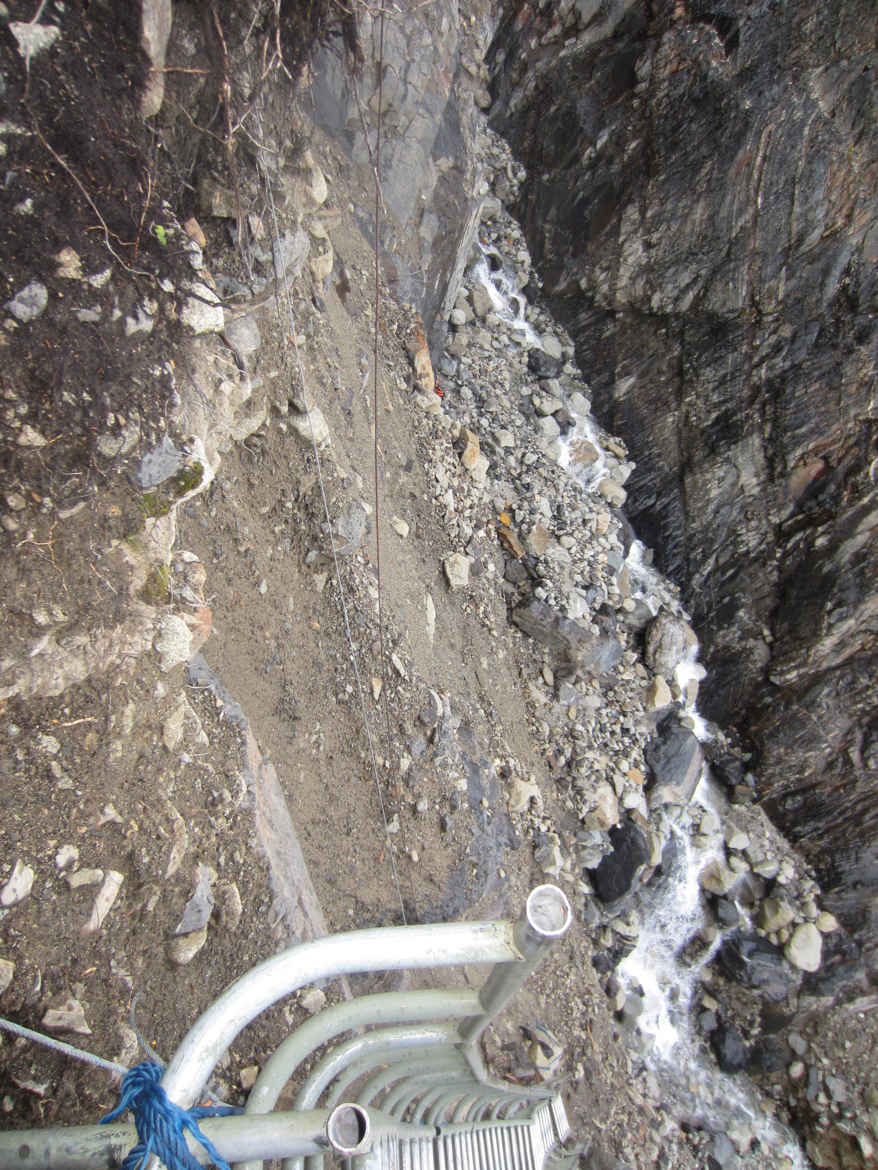 Looking to the guys coming down to assess the situation, we could see that the ground had fallen away, undercutting the path they were standing on. We could only assume that our side looked in the same state, and therefore any movement was risky and any consequences uncertain.